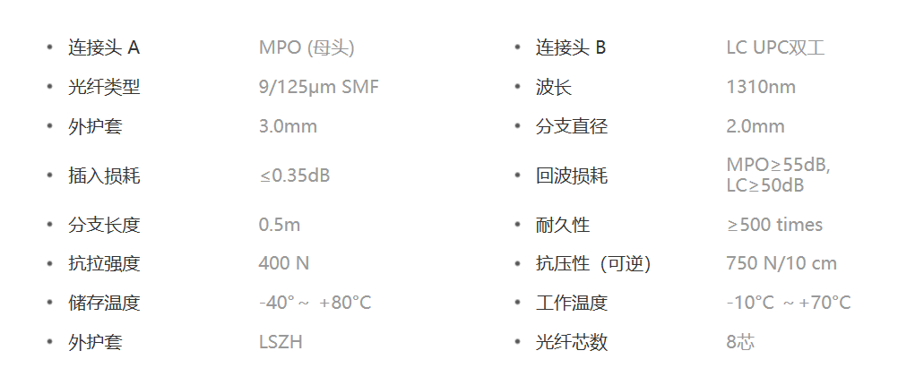 产品名称:思贝科 MPO(母)-8芯 4*LC/UPC 双工单模 分支光纤跳线OS2,极性B,低插损,LSZH