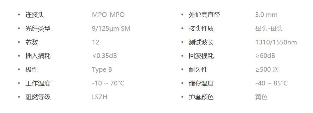 产品名称:思贝科 MPO-MPO12芯(母对母)单模主干光纤跳线OS2 极性B,低插损,LSZH